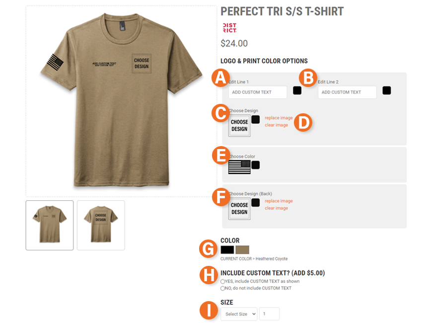 E. FLAG PRINT COLOR - Some items have a reversed US Flag on the right shoulder. You can change the print color of the flag, but can't change the design. Select the small colored square next to the flag to change the print color.