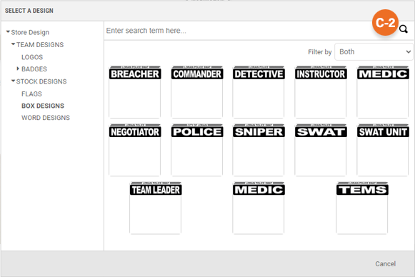 C. CHOOSE A DESIGN (Front) - Any item that allows you to select a design will have a thumbnail showing "Choose Design" or "Add Design". Click this thumbnail and it will open up the design library (see Image C-2 left). The library contains your available team designs and a collection of stock designs. Select which design you'd like to have placed on the item. Once you select a design, select the print color you'd like (see Section B above)